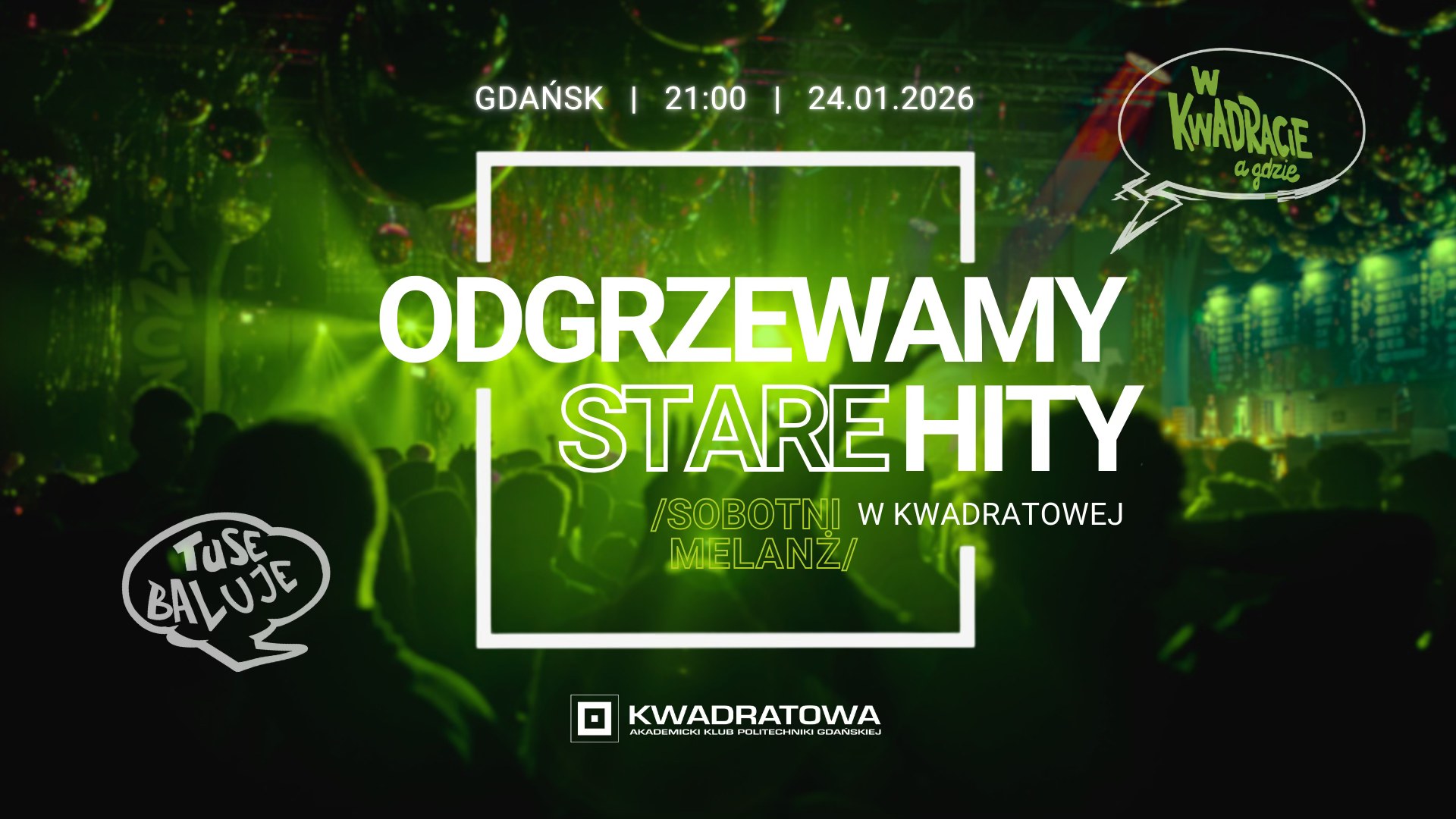 Po całym tygodniu zapraszamy na sobotni melanż do Kwadratowej. Dla odmiany, wracamy z imprezą pod hasłem „Odgrzewamy stare hity”, na której dominować będą utwory które rozgrzewały parkiety dekadę, a nawet kilka dekad temu. Bawimy się niezmiennie na jednym z największych klubowych parkietów w trójmieście