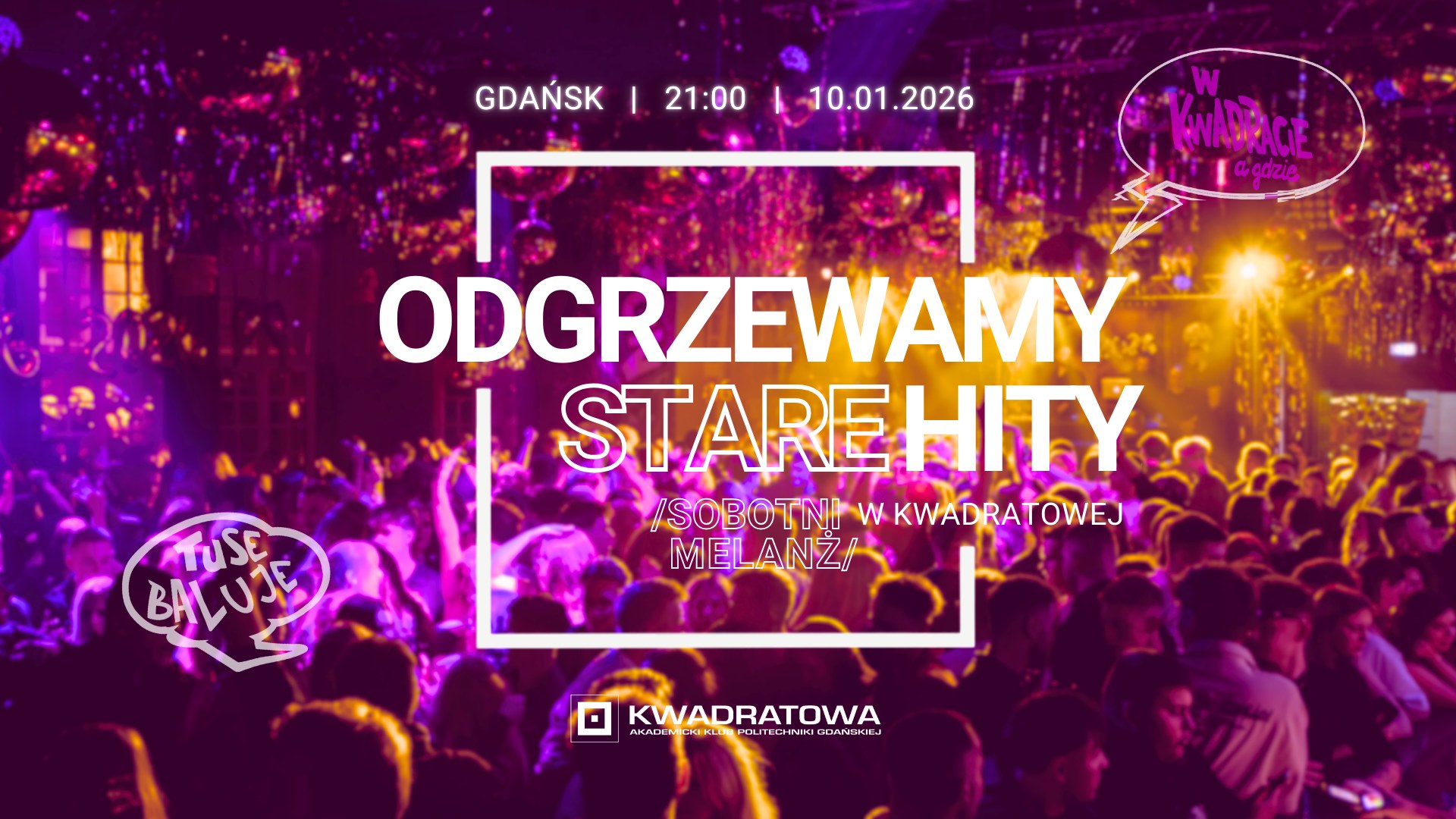 Po całym tygodniu zapraszamy na sobotni melanż do Kwadratowej. Dla odmiany, wracamy z imprezą pod hasłem „Odgrzewamy stare hity”, na której dominować będą utwory które rozgrzewały parkiety dekadę, a nawet kilka dekad temu. Bawimy się niezmiennie na jednym z największych klubowych parkietów w trójmieście